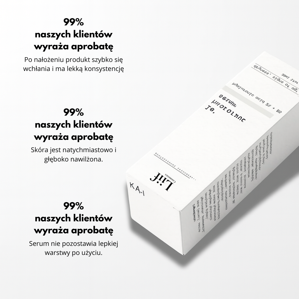 • Niacynamid: Ujednolica koloryt, zmniejsza widoczność porów i rozświetla skórę.